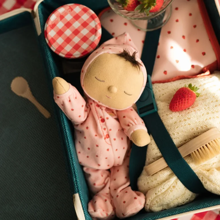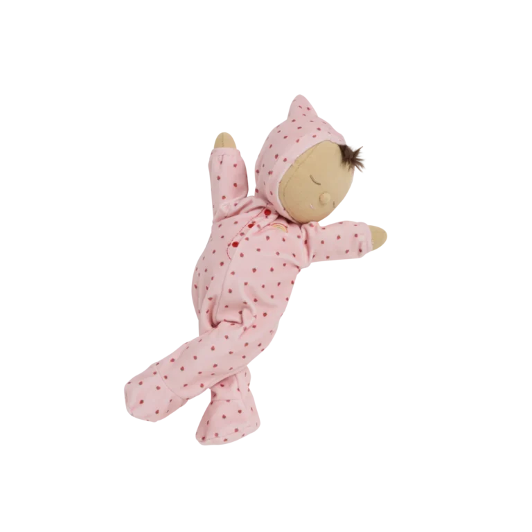Запознајте го нашето ново Olli Ella кукла бебенце, облечено во совршени, меки, розови шпикозни украсени со дизајн со јагоди. Ова наше меко гушкаво бебе е совршено за прва играчка и спомен на вашето бебе.