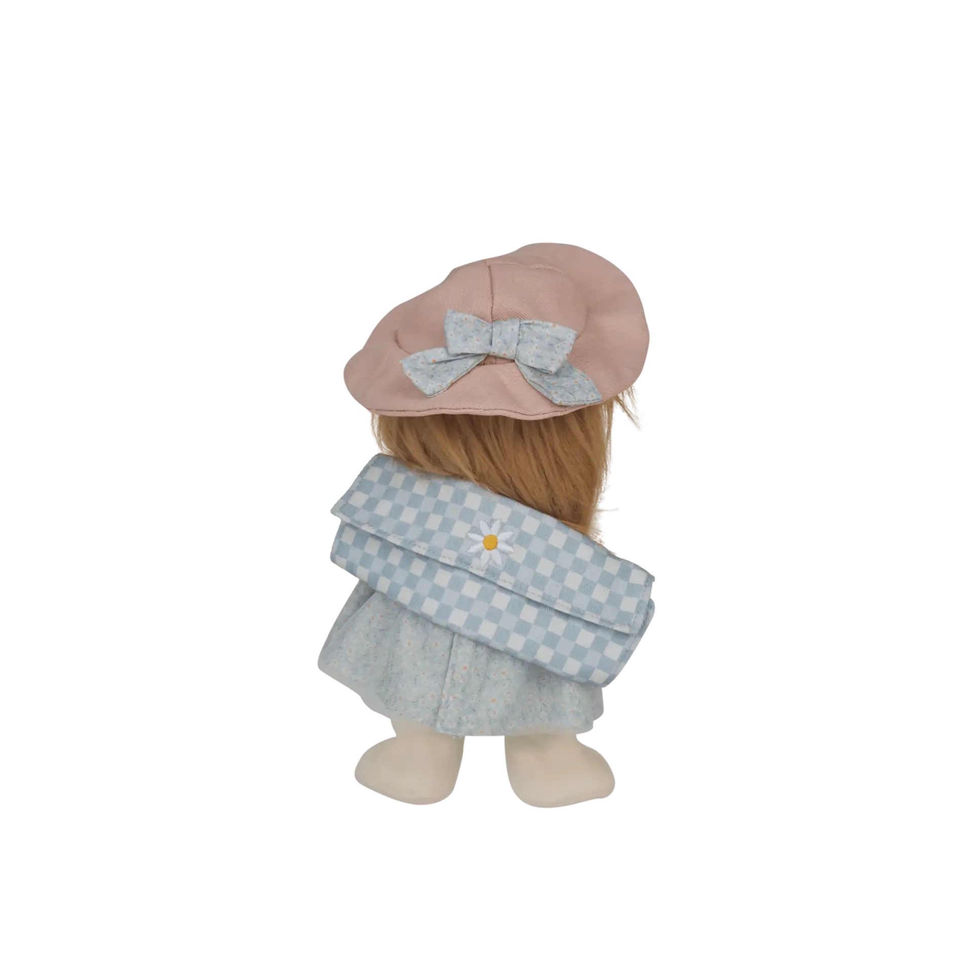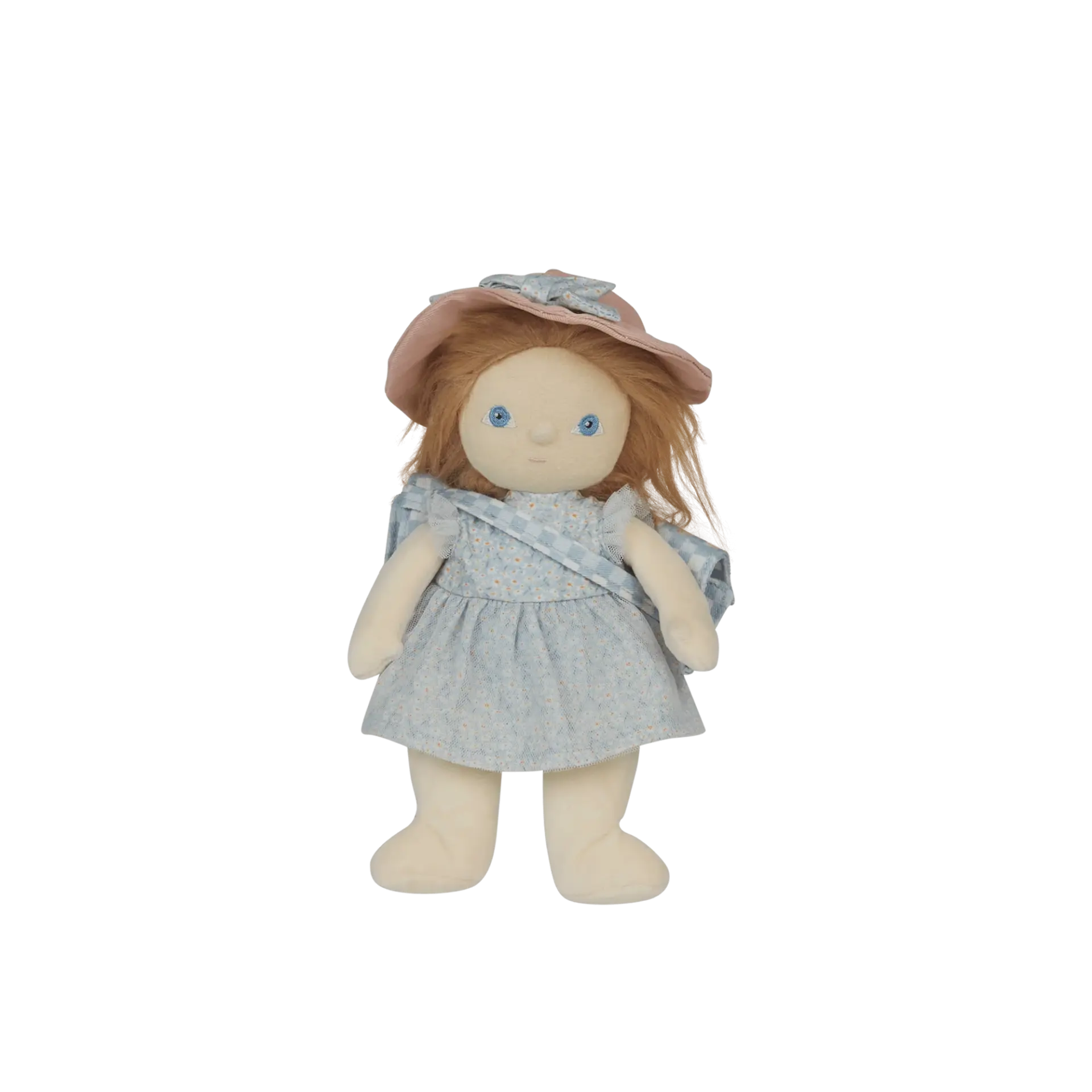 Таа има нежна руса косичка, сини очиња, сино фустанче и розова капа, меко тело без тврди и пластични делови, безбедна и пријатна за детските рачиња.