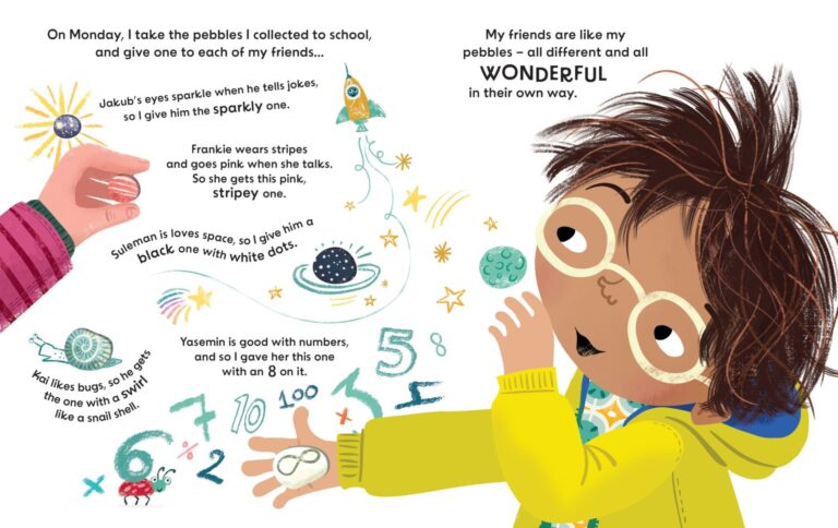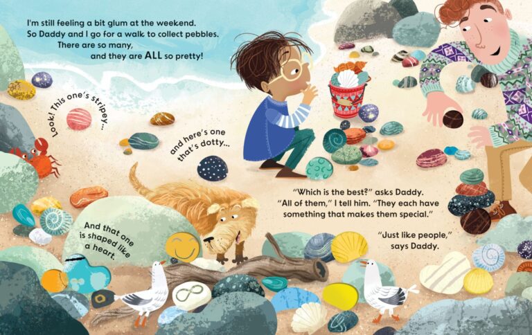 Исто како сите прекрасни различни камчиња што ги наоѓа на плажа, секоја личност има нешто што ја прави прекрасна. И тоа е нешто што треба да се слави. За децата кои почнуваат да се споредуваат со другите околу нив, оваа смирувачка приказна ќе ги потсети да бидат среќни само затоа што се себеси.