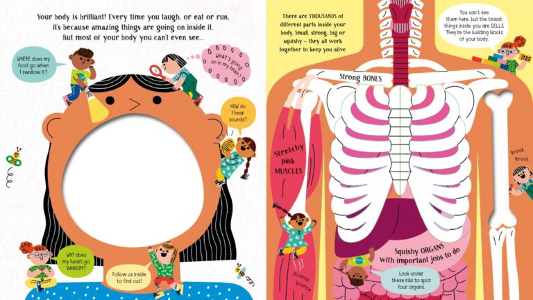 Интерактивна и едукативна книга за деца што ги воведува младите читатели во фасцинантниот свет на човечкото тело. Преку светли, забавни илустрации и прозорчиња низ кои децата можат да „ѕирнат“, книгата на едноставен и визуелно привлечен начин објаснува како функционира нашиот организам – што се случува со храната која ја јадеме, како и зошто дишеме, и како мускулите ни помагаат да подигнеме објекти.