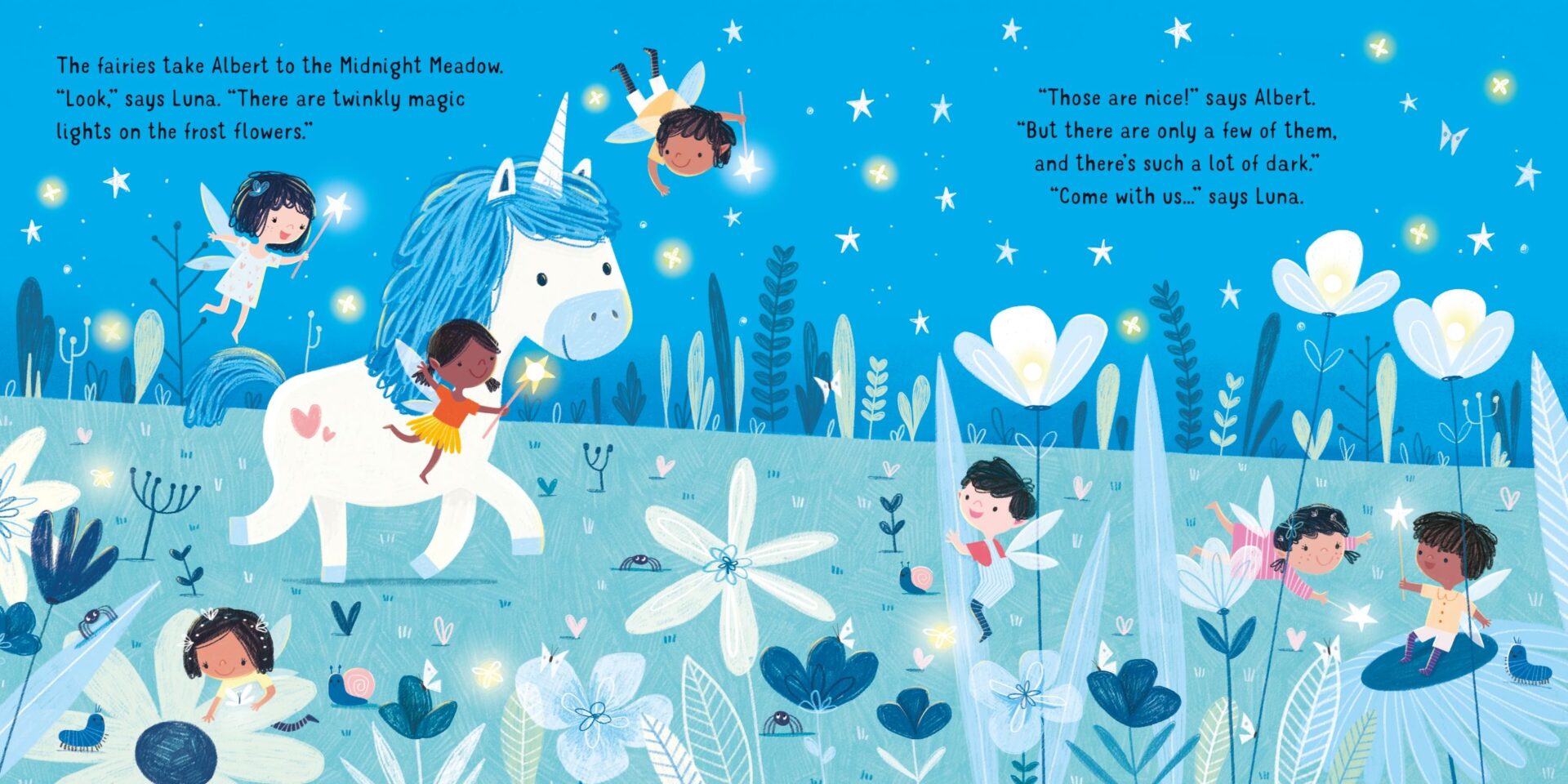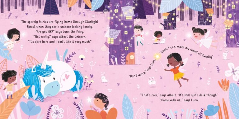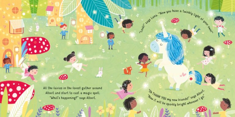 Малите дечиња ќе уживаат гледајќи го светот на самовилите како оживува со малите светла во оваа магична книга со волшебни страници. Еднорогот Алберт не ја сака темнината, но самовилите му го осветлуваат патот и му помагаат да се чувствува подобро. Бројот на светла постепено се зголемува како што патувате низ страниците на една неверојатна приказна која на крај заврушува со 10 светилки. Светкавата магија може да започне! Совршен подарок за било каков празничен момент или едноставно за радост на вашето малечко!